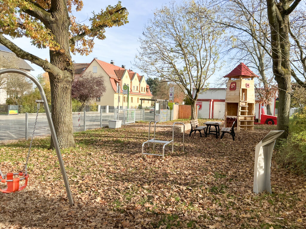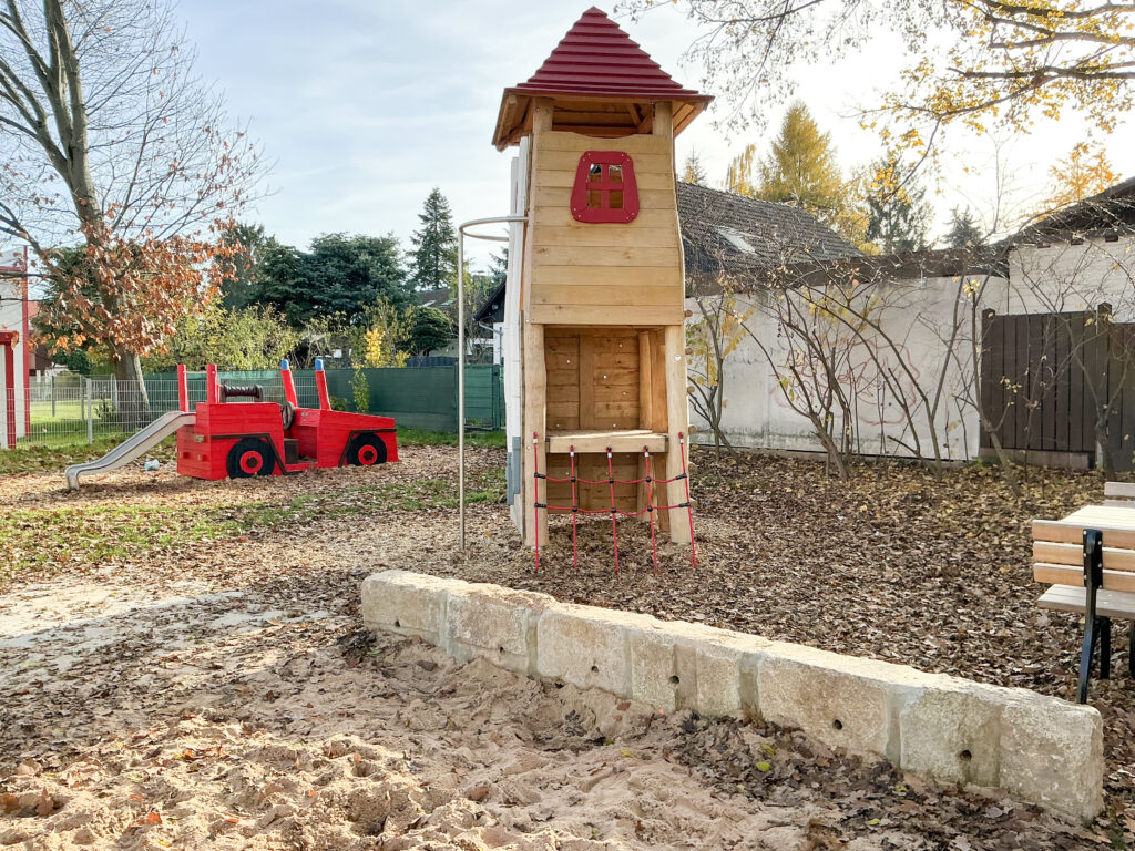 Ausstattung: Klettergerät Schlauchturm, Spielgerät Feuerwehrjeep mit Rutsche, Kleinkinderschaukel, Federwippe, Outdoorfitnessgerät Multi-Trainer;
